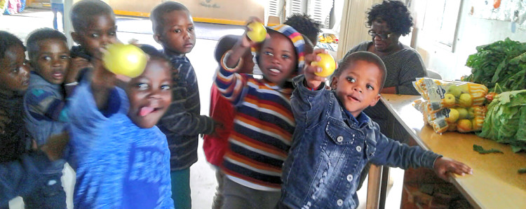 Children at Nomonde enjoying the fresh fruit now added to the extended vegetable scheme